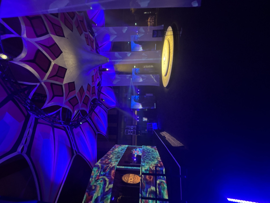 An interior view depicts an expansive event space, likely within the Futurium in Berlin, Germany. The environment is dominated by deep blue and purple ambient lighting, creating a futuristic or immersive atmosphere. Overhead, a complex, multi-faceted fabric ceiling structure, resembling a large stylized flower or star, is illuminated with purple and blue light. A prominent, conical white fabric element hangs centrally from this structure. On the left side of the frame, a raised platform or booth is visible. Its front and side surfaces are clad with large LED screens displaying vibrant, abstract, swirling patterns in multiple colors. A circular logo featuring the word "NOVA" in white text on a golden-orange background is centrally displayed on the platform's front screen. A dark railing runs along the edge of this platform. To the right, a circular, elevated platform, illuminated with a warm golden light, serves as a central exhibit. It features a patterned surface. Surrounding this platform are several tall, rectangular screens or banners displaying images of ethereal blue-toned landscapes, possibly mountains or skies. Interspersed with these screens are vertical panels of translucent white fabric or drapes, also reflecting the blue lighting. One vertical screen clearly displays the text "SHRPIV". The flooring throughout the space is dark, appearing to be black carpet. Additional screens and event infrastructure are dimly visible in the background. No individuals are present or discernibly active within the visible scene. The overall impression is that of a prepared exhibition or event space awaiting attendees, characterized by intricate lighting and advanced display technology.