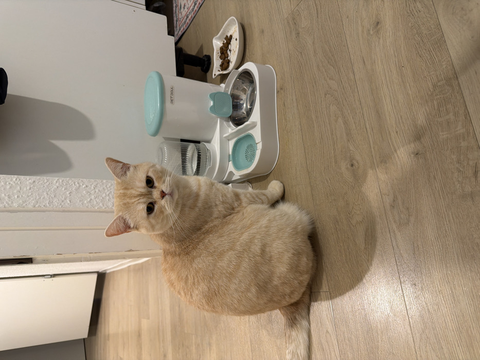 The scene depicts an indoor domestic environment in Blankenfelde, Germany. A light orange, short-haired tabby cat is seated upright on a light wood laminate floor, facing the viewer with a neutral expression. To the cat's right is a white and mint green PET DOOL automated pet feeding station, which includes a clear water reservoir, a shallow water dish with a light blue grated insert, a main dispenser unit, and a stainless steel bowl. Adjacent to this station, a separate white, cat-head shaped dish contains brown kibble with some scattered crumbs. The background features a partially open white door and frame on the left, revealing a glimpse of another room, and a white cabinet or appliance with black support feet on the right, beneath which a small, patterned rug is visible.