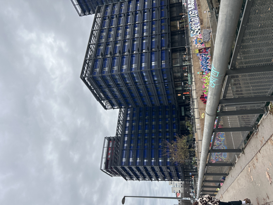 The image depicts an urban scene in Strasbourg, France, specifically along a canal facing the OKKO HOTELS Strasbourg Centre complex, likely viewed from a bridge or elevated walkway adjacent to the Canal du Faux-Rempart. The scene is set under an overcast, light grey sky. In the midground and background, two prominent, multi-story modern buildings are visible. These structures feature a distinctive dark, grid-like external framework enclosing numerous uniformly blue-tinted window panels. The building on the right displays white "OKKO HOTELS" signage. The building to its left, partially obscured by a tall, grey street lamp post, is similar in construction and includes a section with red architectural elements on its upper levels. The ground floors of these buildings appear to house commercial establishments, with some visible outdoor seating areas featuring tables and chairs. Sparse, bare-branched trees are situated at the base of the buildings. In the immediate foreground, a grey concrete walkway or bridge surface is visible, strewn with scattered brown leaves. A robust metal railing, comprising a thick grey top bar and a dark mesh-like lower section, runs horizontally across the lower portion of the frame, acting as a barrier. Below this railing and to the right, a narrow waterway or canal is partially visible. The concrete embankment on the far side of this canal is extensively covered in multi-colored graffiti, including discernible text such as "Serious Words" and other tags. A single individual is partially visible on the far left edge of the frame, walking away from the viewer. They are wearing a brown and white patterned jacket, dark trousers, and light-colored shoes.