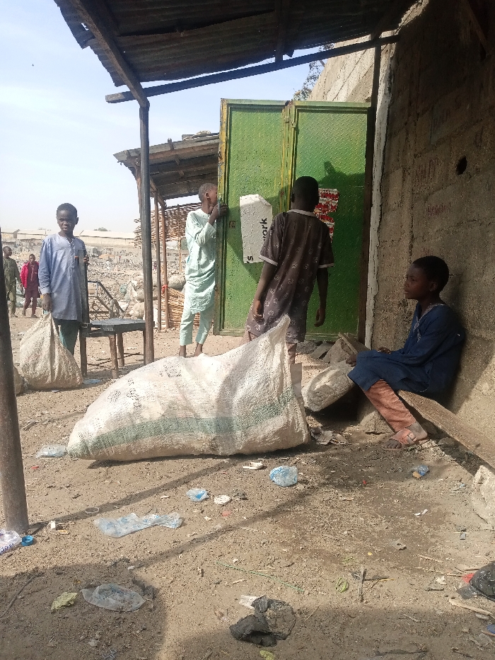 This image depicts an outdoor scene in Kawaji, Nigeria, on an unpaved, dusty ground littered with debris. Approximately five to six individuals, primarily young males, are visible. In the foreground right, a young male wearing a blue tunic and patterned trousers with light pink sandals is seated on a wooden plank, leaning against a rough-textured, light brown wall. He looks towards the left. A large, off-white woven sack filled with material rests on the ground in the center foreground, surrounded by discarded plastic bottles, wrappers, and other refuse. Towards the mid-ground, another young male in a dark patterned top stands facing a pair of large, green, corrugated metal doors. To his left, a third young male in a light green tunic stands near the doors, looking towards them with his left hand raised. A white box with visible text "s'work" is attached to the green door. Further left, a fourth young male in a light blue tunic stands holding a thin stick or tool, looking directly at the viewer. Another similar off-white woven sack is at his feet. Behind him, a small, dark-colored table or stand is present. In the background, beyond the immediate structures, several indistinct figures are visible amidst what appears to be a large collection of materials or refuse under a clear sky. A corrugated metal roof supported by metal poles is visible in the upper left, casting shadows on the ground. The overall environment suggests a collection or processing area for discarded materials.