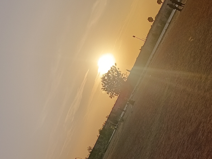 sunset over a field, with a tree in the middle ground silhouetted against the bright sun. The sky is a gradient of yellow and orange, with some faint clouds visible. There's a structure and a couple of figures near the top. The field takes up a large portion of the frame and appears mostly brown. A low wall and greenery run along the field's edge.