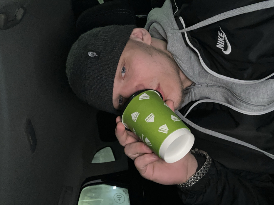 The image displays a young adult male seated inside a vehicle in Dobryanka, Russia. The subject has light skin and blue eyes. He wears a dark grey knitted beanie with a white "The North Face" logo patch, a grey hooded sweatshirt, and a black jacket bearing a white Nike logo on the left chest. A silver-colored chain link bracelet is present on his left wrist. He is actively drinking from a green paper cup, decorated with white sandwich icons, holding it to his lips with his right hand. The vehicle's interior is dimly lit, and a numerical display showing "+0" is visible through a rear passenger window on the left.