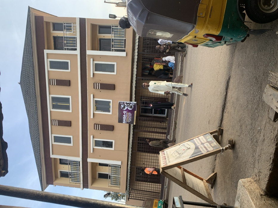 The image depicts a daytime street scene on Abubakar Barde Street in Jos, Nigeria, featuring a three-story commercial and residential building