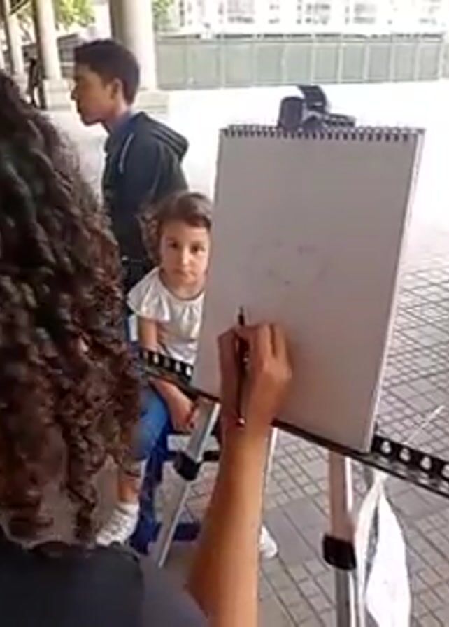 A woman with curly hair is drawing a caricature of a little girl sitting on a stool. The woman is holding a pencil and working on a sketchpad mounted on an easel. The sketch shows the outline of the girl's face. Behind the woman is a young boy walking, and other people are visible in the background. They are on a covered outdoor walkway with a tiled surface. Buildings can be seen in the distance.