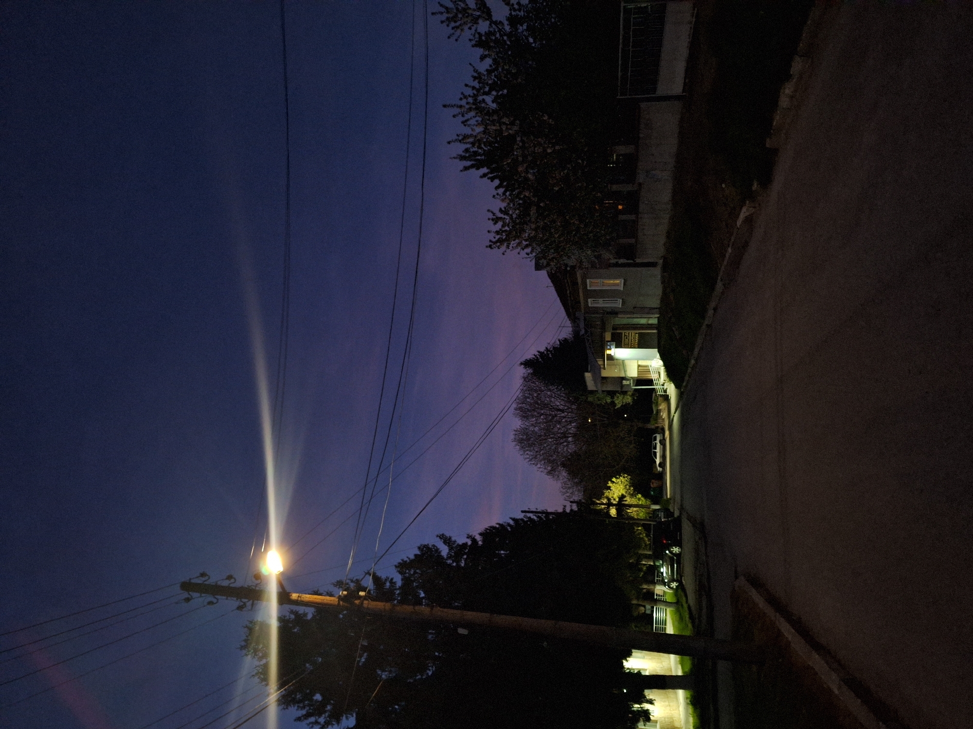 street scene at dusk in Loznitsa, Bulgaria. The sky transitions from dark blue to purple. A street light illuminates a telephone pole and wires. A sidewalk borders the street. Buildings and parked cars line the opposite side of the street, some with lights visible. Trees are present, casting dark shadows.