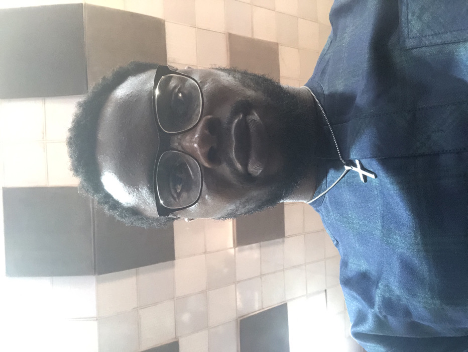A close-up, low-angle portrait features an adult male positioned centrally indoors, in the city of Karu, Nigeria
