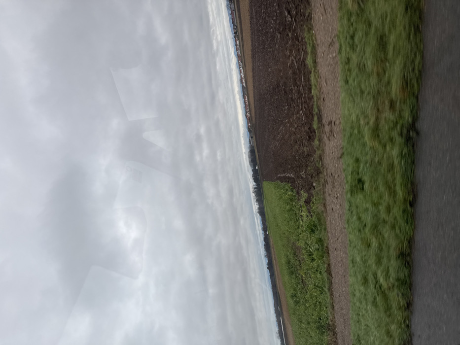 The image displays an expansive rural landscape in Nordhouse, France, under an overcast, light gray sky. In the immediate foreground, a dark, reflective surface, likely pavement, is visible, topped by a strip of vibrant green, short-cut grass exhibiting horizontal motion blur. A dirt path separates this grass from two large agricultural fields. The field on the left contains dense green, leafy vegetation, while the field on the right consists of dark brown, freshly tilled soil with visible furrows. On the distant horizon, a line of dark trees is visible, and to the right, a cluster of residential buildings with light-colored walls and dark roofs indicates a distant settlement. Faint outlines of hills or mountains are discernible beneath the low cloud cover. No individuals, animals, or active movements are present. Reflections, consistent with viewing through a window, are visible in the upper portion of the frame.