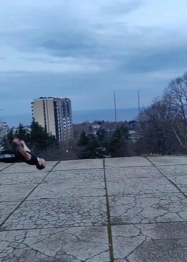 A man does a back handspring on a cracked concrete surface. The man is wearing a black t-shirt and patterned black pants. In the background is a large building, bare trees, and a cloudy sky. The ground is cracked and overgrown with small green plants. The man’s movement is fast and fluid as he completes the acrobatic maneuver.