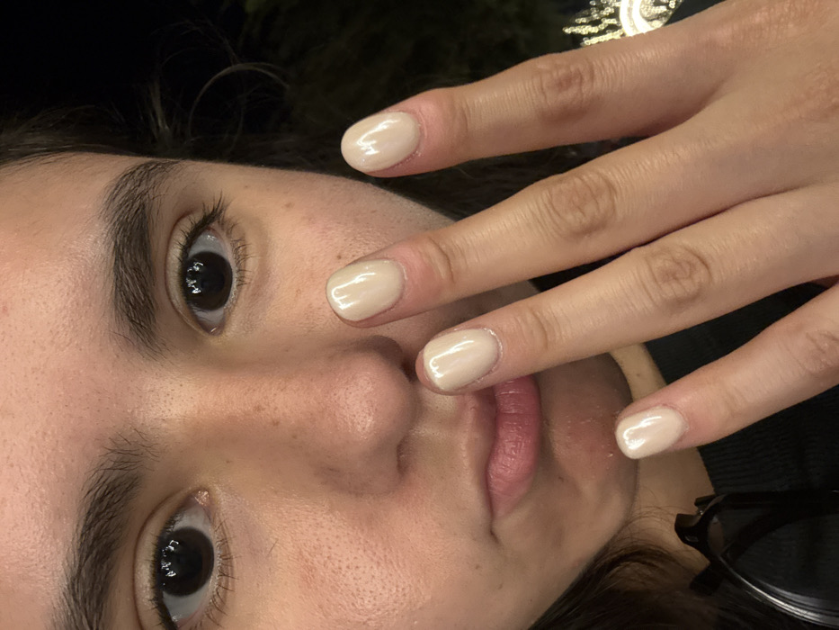 A close-up, angled shot of a person's face and hand. The focus is on the person's left eye, nose, and mouth. Their hand is positioned with fingers near their face, showing manicured nails with a pale, glossy polish. The lighting is low, creating soft shadows on the face and highlighting the shine on the nails. Details like eyebrows, eyelashes, and skin texture are visible. Sunglasses can be seen on the bottom right corner.