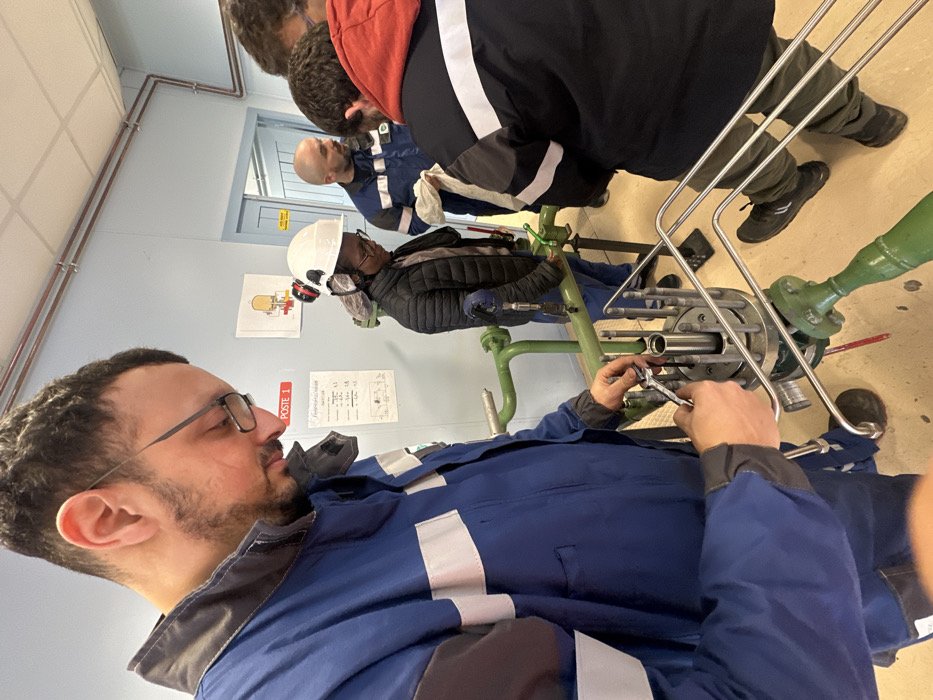The scene depicts an indoor industrial or vocational training environment in Saint-Étienne-de-Montluc, France, possibly a workshop or laboratory, characterized by light-colored walls, exposed utility conduits, and technical equipment. Five individuals are present, engaged in what appears to be a practical exercise involving industrial machinery. In the foreground, a male with dark hair, a beard, and eyeglasses, wearing a blue work jumpsuit with reflective grey stripes, is actively manipulating a metallic industrial component. He is using a chrome wrench to adjust or secure a bolt on a circular flange, from which multiple threaded rods protrude vertically. This component is connected to green-painted piping that runs horizontally and vertically. To the mid-ground right, a female individual with dark skin and eyeglasses wears a dark puffer jacket, a white hard hat, and over-ear hearing protection. She is observing the equipment, her gaze directed downwards towards the green piping and the central component. Further in the background, a bald male in a blue work jumpsuit stands, holding a white cloth in his left hand, looking towards the activity at the central equipment. Partially visible behind him and to the far right are at least two other individuals, one wearing a red hoodie, observing the scene. The background wall features a red and white sign labeled "POSTE 1" and a schematic diagram of industrial equipment. Copper-colored pipes run along the top of the wall. The floor is light-colored and uniform. The overall scene suggests a supervised practical training or maintenance operation.