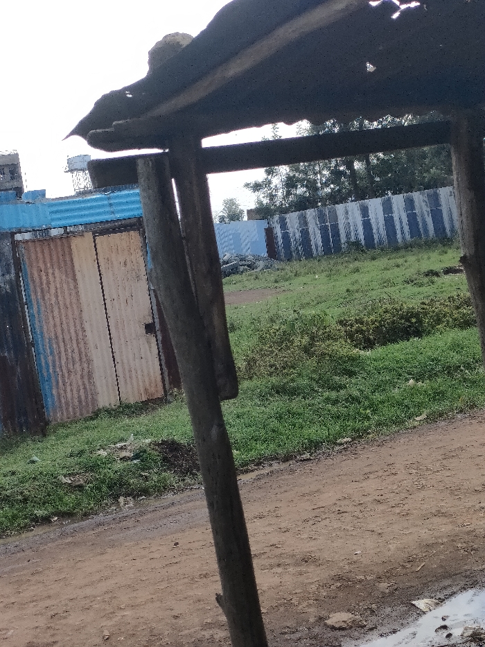This image depicts a semi-developed outdoor environment in Juja, Kenya. In the immediate foreground, a dark corrugated metal roof structure supported by three rough-hewn wooden poles partially frames the scene from the top and right. The roof shows signs of wear and minor damage. Below this, an unpaved dirt road or path, wet in sections, traverses the lower portion of the frame. To the left of the path, a building constructed from corrugated metal sheets is visible, featuring vertical sections painted blue and rust-brown. A double door, also made of corrugated metal and exhibiting similar coloration, is centrally located on this structure. Beyond the dirt path, a sparse area of green grass and low-lying shrubs extends across the midground. In the background, a fence composed of alternating blue and unpainted corrugated metal sheets runs horizontally. Behind this fence, a pile of light-colored rubble is visible. Further in the distance, a line of trees with green foliage is present under an overcast sky. To the far left in the background, a glimpse of a structure with a water tank on its roof is discernible. No individuals are present in the scene.