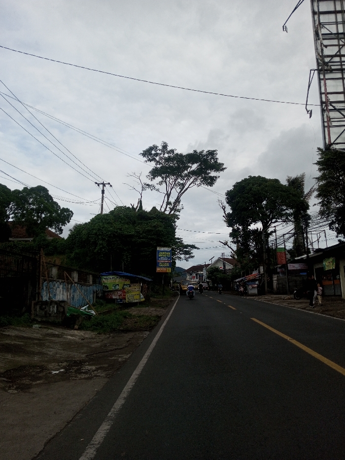 The image depicts a street scene in Sandamal Eliya, Sri Lanka, under an overcast sky. The view is from a low angle, looking down a dark asphalt road that recedes into the distance. A solid white line marks the left edge of the road, and a solid yellow line delineates the center. On the left side of the road, an unpaved shoulder with sparse vegetation abuts a low, weathered concrete wall with remnants of blue and white paint. Behind this wall, a small, makeshift kiosk with a light blue corrugated canopy stands, featuring several yellow and multicolored promotional signs. This kiosk is situated below a dense, overgrown bank covered in dark green foliage and large trees. A utility pole with multiple overhead lines is visible amidst the trees. Further back on the left, a large blue billboard with white text is partially obscured by the foliage, and a building with a reddish-brown roof is visible behind the trees. On the right side of the road, a paved sidewalk or shoulder fronts a series of single-story commercial buildings or shops, characterized by awnings and various signs. Several people are standing near these shops in the mid-ground. A tall, unclad metal framework, likely a large billboard structure, extends from the mid-ground upwards into the sky on the far right. Numerous overhead utility lines crisscross the upper portion of the frame. Several motorcycles are present on the road, traveling away from the viewer. One motorcycle with a rider is clearly visible in the mid-ground, and other vehicles are further down the street. No direct interactions between individuals are clearly discernable. The overall lighting is muted due to the heavy cloud cover.
