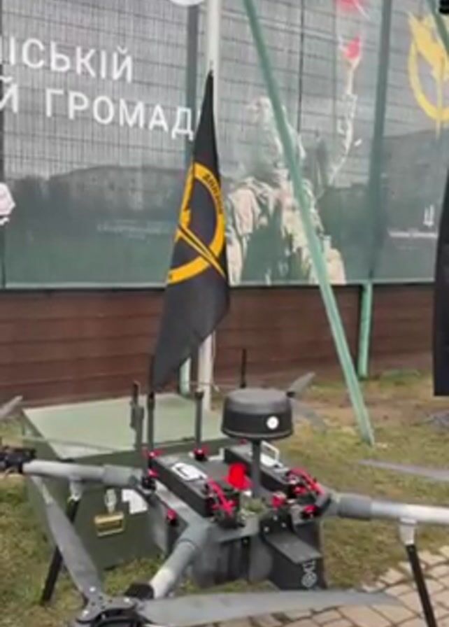A static shot shows a gray drone with six rotors standing on a green field. The drone rests on tall black legs. At the center of the drone, there is a black cylindrical structure with a small white light on top. A black flag with a yellow emblem flutters in the breeze from a pole behind the drone. Behind the drone and pole, there is a backdrop with a graphic of a soldier on it. The grass is green and the sky is overcast.