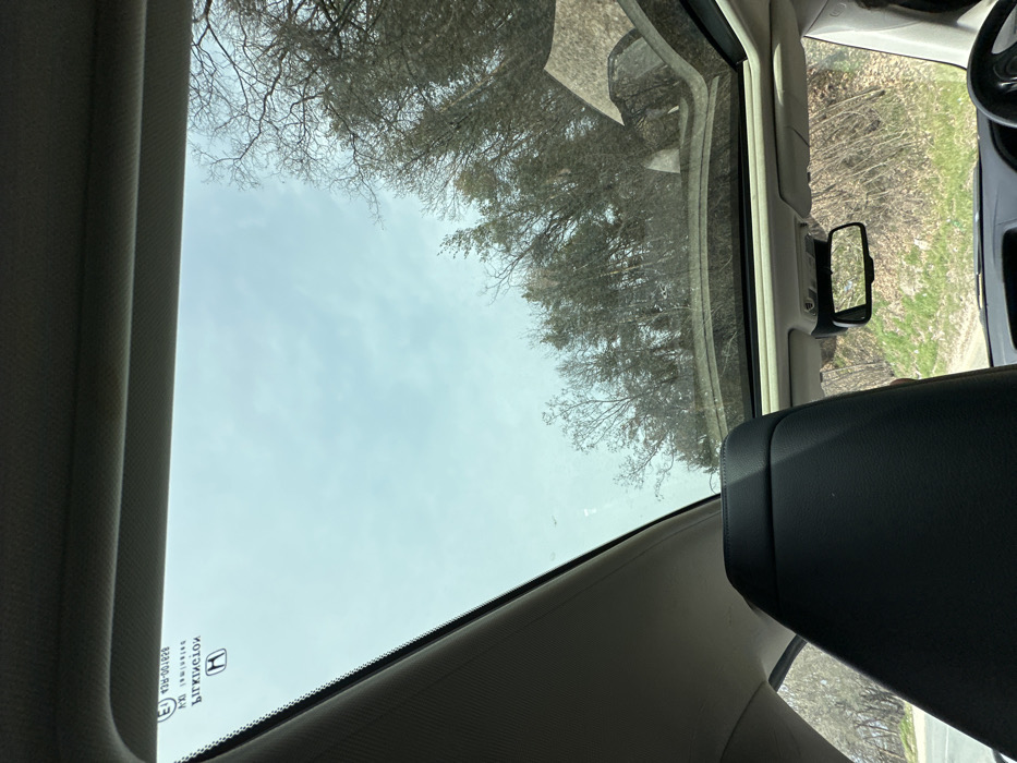 The image displays an interior perspective from a vehicle, looking upward and forward through a panoramic glass roof. A black headrest is centrally located in the lower portion of the frame. The vehicle's interior headliner is a light, neutral color. Inverted reflections on the glass reveal a Honda logo and alphanumeric glass specifications, including "DOT M281-REA" and "AS2." Beyond the glass, a light blue sky with scattered, faint cloud cover is visible. To the right, a dense collection of predominantly bare deciduous trees and some conifers borders the area. A paved road or path is discernible along the far left edge of the frame. The ground adjacent to the road consists of dry grass and dormant vegetation. This scene is located in Karnare, Bulgaria. No individuals are visible.