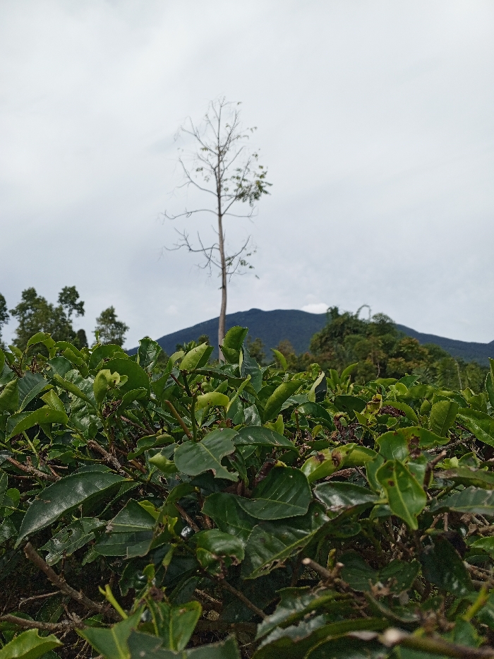 This image presents a rural landscape, reportedly located in Silvino Lobos, Philippines. The foreground is dominated by a dense growth of vibrant green foliage, likely a cultivated plant, with individual leaves exhibiting minor surface irregularities. In the midground, a tall, slender deciduous tree with sparse branches and minimal leaf cover stands centrally. To its left, a group of other fully foliated green trees is visible. A prominent, dark green mountain range occupies the distant background, extending across the horizon. The sky is uniformly overcast and light grey. No individuals, animals, or man-made structures are present within the captured scene.