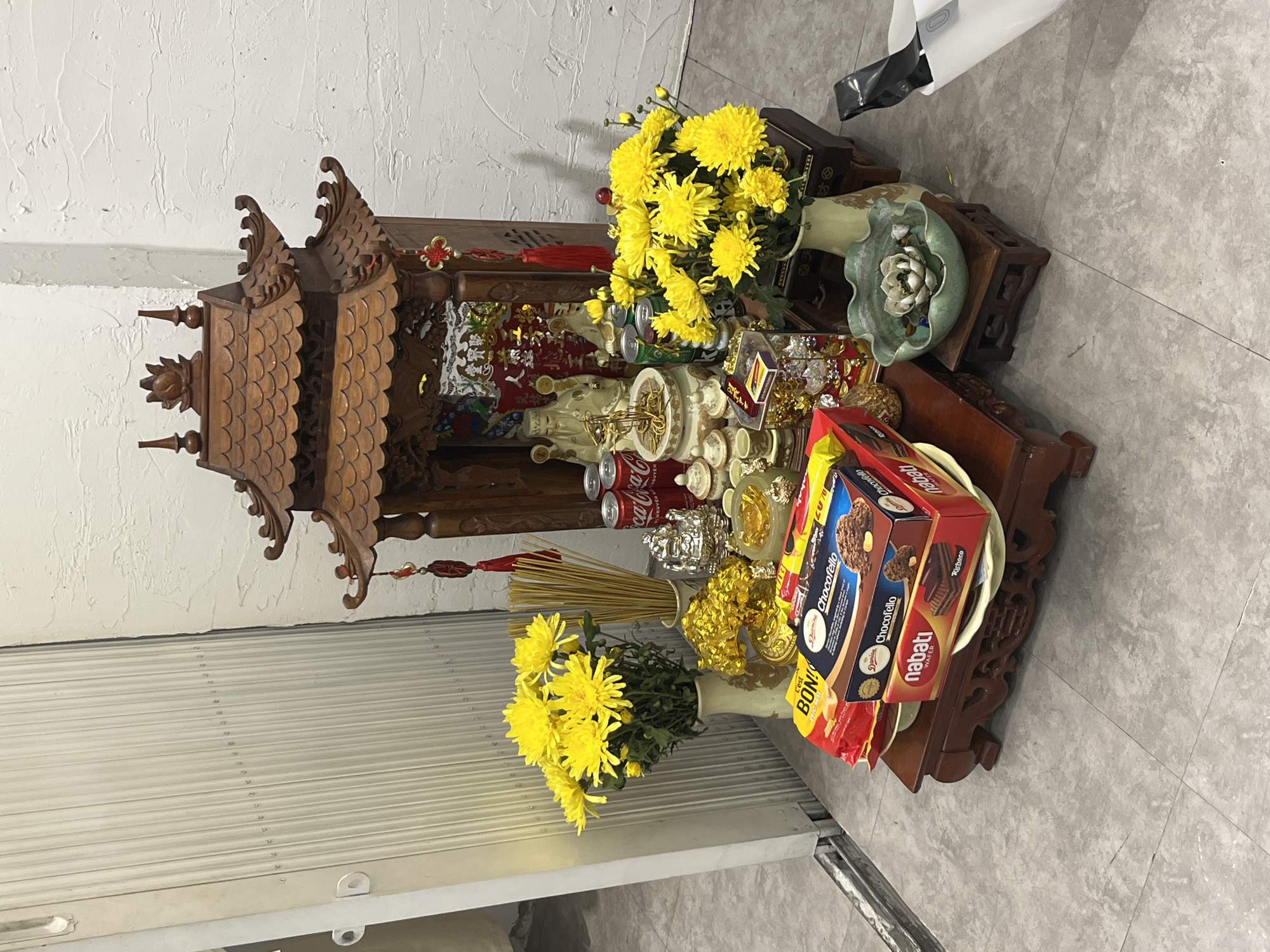 An indoor scene in Hà Nội, Vietnam, displays a meticulously arranged household or business altar positioned on a light grey tiled floor against a white textured wall. Central to the setup is a multi-tiered, intricately carved wooden shrine, resembling a miniature temple. Inside the shrine are several figurines, likely deities such as the God of Land and God of Wealth, along with a red banner featuring Vietnamese characters. Numerous offerings are arranged on various dark wooden stands around the shrine. These include two vases containing bouquets of bright yellow chrysanthemums. A bundle of unlit incense sticks stands upright in a white vase. Three red Coca-Cola cans are placed near the shrine. Food offerings consist of multiple packaged snacks: "Chocofello" cookies, "Nabati Wafer" (Richeese flavor), and "Bon" products, stacked on a lower wooden stand. Other items on the altar include small silver-colored statues (one resembling Ganesha), golden-colored decorative ingots, multiple small cups, and various ornate dishes and containers. A distinct light green, ruffled ceramic bowl holds water, a white lotus-like object, and small stones, resting on its own small wooden stand. To the left of the altar, a vertical segment of a light-colored, corrugated metal security door or shutter is partially visible, indicating an entranceway. The scene is static, devoid of people, and appears to be a devotional or ceremonial display.