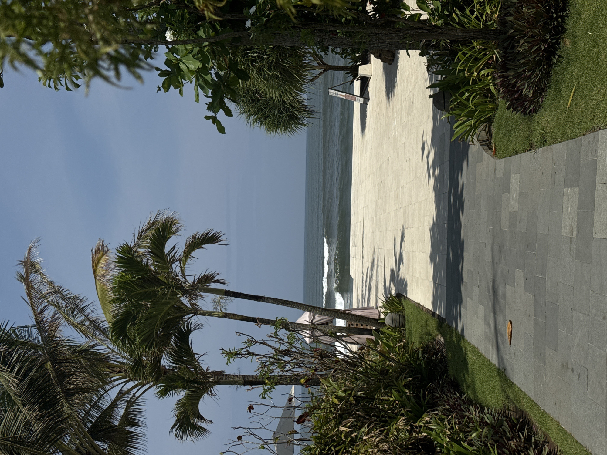 The image depicts a tropical coastal scene in Belalang, Indonesia, on a clear, sunny day. A grey-tiled pathway extends from the bottom of the frame, bordered by manicured green grass and dense tropical foliage, transitioning into a wider, light-colored paved area in the midground. Several palm trees and other lush greenery are prominent throughout the scene. On the left side of the paved area, a light-colored fabric tent or cabana with a peaked roof is visible. To the right, a spiky-leafed tree stands near a dark A-frame sign positioned on the paved surface. Beyond the paved area, the ocean extends to the horizon under a light blue sky, with visible white-capped waves breaking near the shore. Shadows from overhead trees are cast across both the grey-tiled and light-colored paved surfaces, indicating strong sunlight. A single brown leaf rests on the grey pathway in the lower left. No individuals are present.