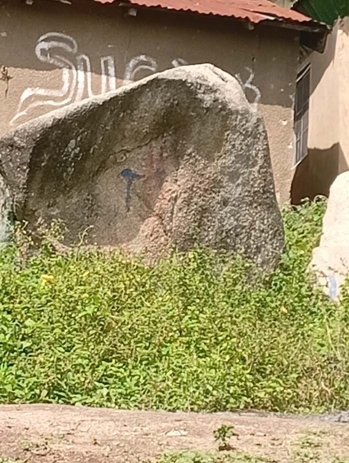 An irregularly shaped, grey boulder occupies the mid-ground, featuring a blue painted symbol resembling an arrow on its visible face. Behind the boulder, a single-story building with a light-brown wall and a dark-red corrugated metal roof is visible. White graffiti, including partially obscured letters "Su" and "k" or "3", is present on the building's wall. A vertical window with a metal frame is visible on the building's right side. Dense green vegetation surrounds the base of the boulder and extends across the lower portion of the image. A strip of bare, light-brown soil or dirt path is visible at the very bottom of the frame. The scene is located outdoors in the city of Madalla, Nigeria, under natural daylight. No people or actions are depicted.