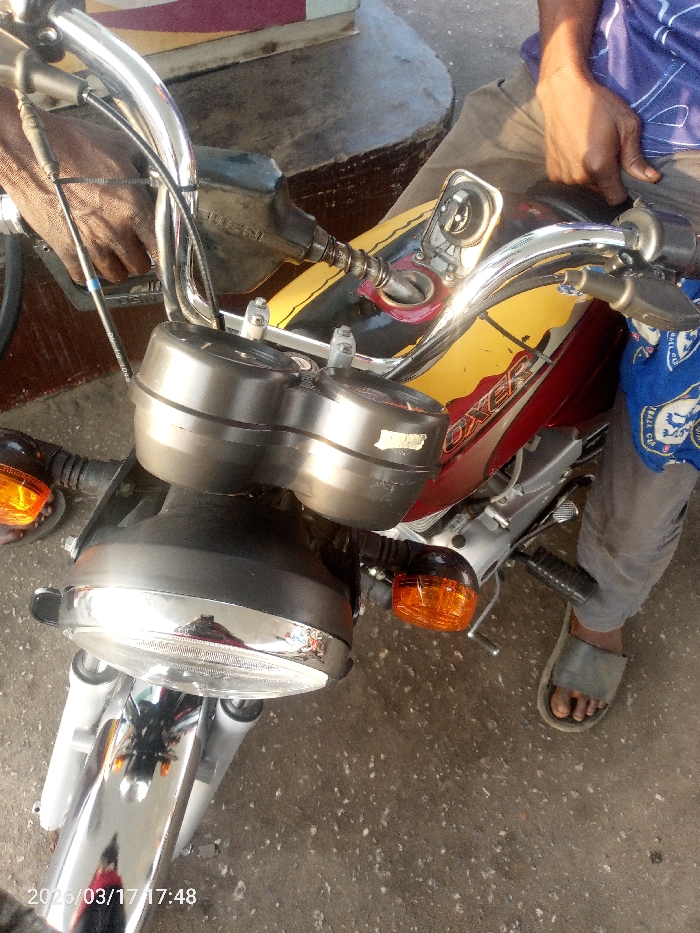 A red and yellow Boxer motorcycle is being refueled at a gas station in Lokoja, Nigeria, on March 17, 2023, at approximately 17:48