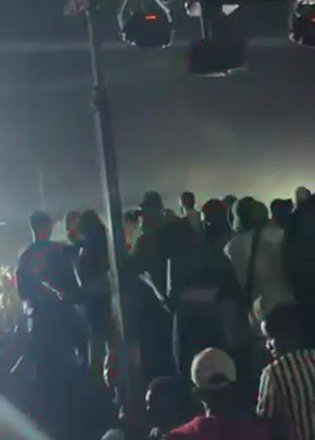 The scene depicts a lively outdoor concert or festival at night, with a large crowd of people visible. A metal lighting rig with multiple spotlights is positioned overhead, casting both bright white and red light onto the crowd below. The crowd is dense and composed of people of different ages and appearances, mostly dressed casually. Some individuals are actively dancing and moving to the music. The atmosphere appears energetic and festive.