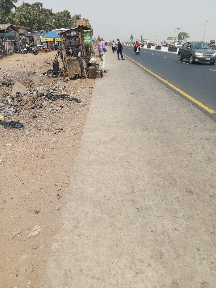A roadside view shows a narrow concrete pavement adjacent to a busy road. A yellow line marks the road's edge. Several people walk and drive on the road. Alongside the pavement is a dirt area covered with litter, leading to makeshift shops and stalls. An old wooden structure stands out. In the background, distant trees and an overcast sky complete the scene.