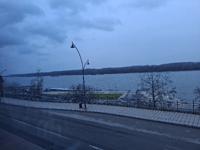 The image provides a wide-angle view of the Danube River and its adjacent promenade in Ruse, Bulgaria