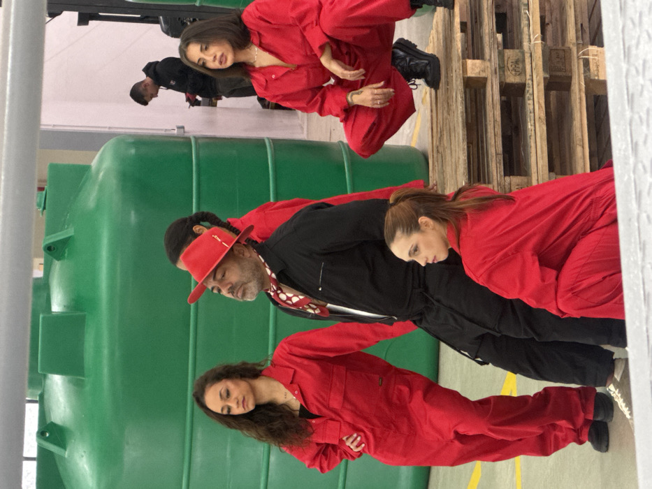 The image presents an indoor scene in Torres Vedras, Portugal, featuring six individuals within what appears to be an industrial or large workshop environment. In the center, a middle-aged male with a grey beard wears a black garment, a red wide-brimmed hat, and a patterned white and red scarf, looking upward and to his right. To his left, a female with long dark hair, dressed in a red jumpsuit and dark shoes, stands with her left hand on her hip. To his right, a female with dark, shoulder-length hair, also in a red jumpsuit and black boots, squats on a stack of light-colored wooden pallets, one of which bears "PPA" branding. In the lower foreground, a female with light brown hair tied in a ponytail, wearing a red jumpsuit and light-colored sneakers, squats, facing right. A fifth individual in a red jumpsuit is partially visible behind the central male. In the background, a male in a black hooded top and dark pants stands near a white wall, looking down at a handheld device. The mid-background is dominated by two large, green, cylindrical industrial storage tanks. The floor is light grey concrete with yellow demarcation lines. A horizontal white beam or rail is visible in the upper foreground.