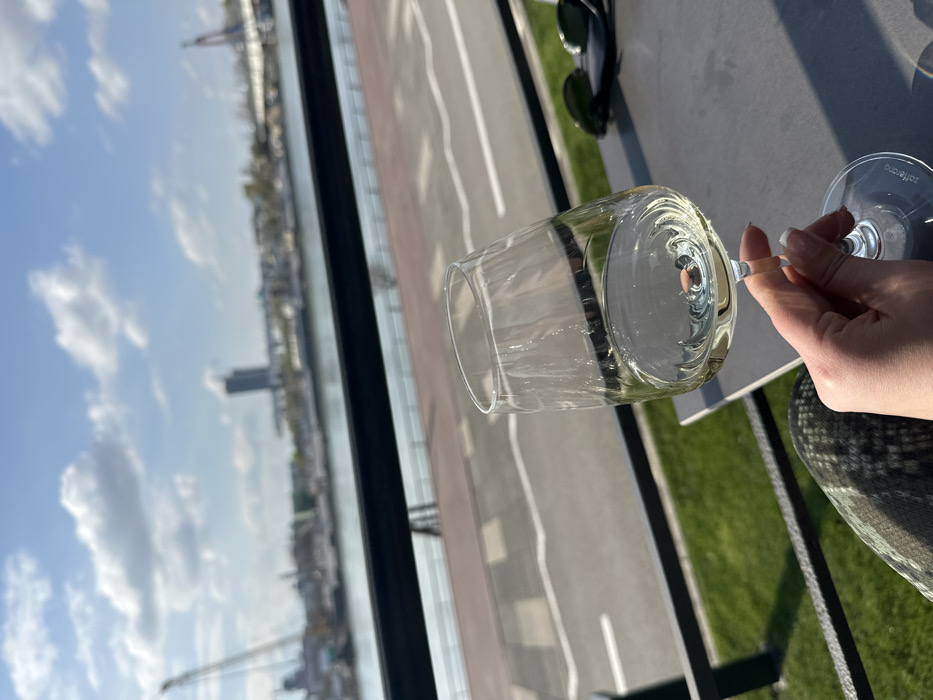 - "A first-person perspective photograph captures a hand holding a stemmed glass containing a pale yellow liquid, likely white wine" by FM-E8AIA3, licensed under CC BY 4.0