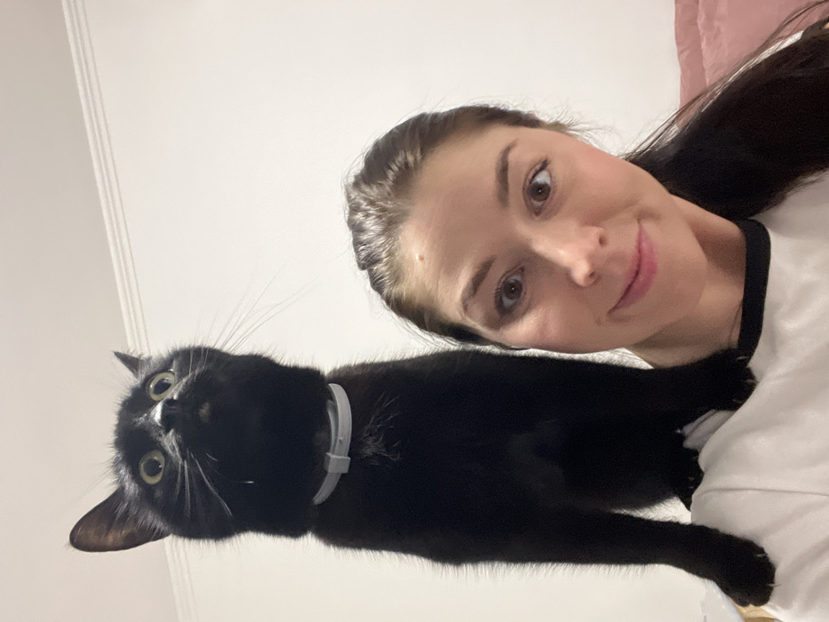 The image depicts a black cat perched on the right shoulder of a female subject, both positioned indoors against a light-colored wall