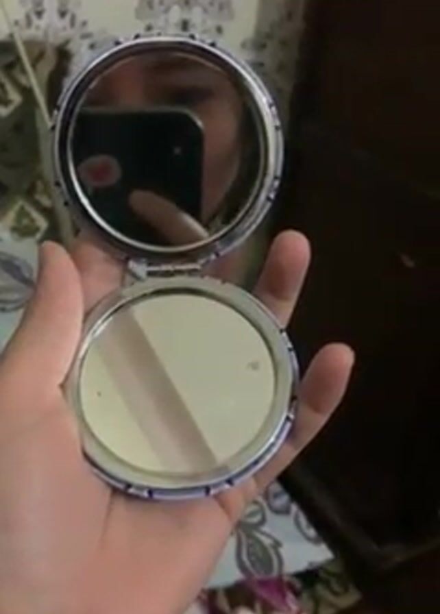 A hand holds an open, round, double-sided compact mirror with a blue and white patterned rim. The top mirror reflects a person holding a smartphone. The bottom mirror has a visible scratch or smudge across its surface. The background includes a patterned surface, possibly bedding or fabric, and a dark wooden cabinet.