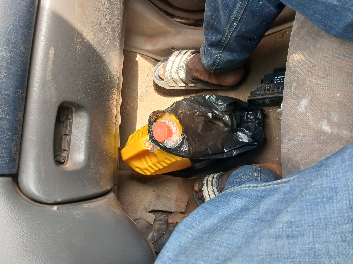 The image depicts the interior of a vehicle's front passenger footwell, identified as being in Karshi, Nigeria. A yellow plastic jerry can with an orange cap, partially wrapped in a black plastic bag, rests on the vehicle's floor. To the immediate right of the jerry can, a black electronic component or device is visible on the floor. The vehicle's floor appears dirty and worn, covered in dust or sand. Above the footwell, a grey plastic dashboard or glove compartment panel shows signs of wear, scratches, and dust accumulation, with a latch mechanism visible. In the foreground, two human legs are prominent. The leg on the left is clad in blue denim jeans and a brown sandal with black and white striped straps. The leg on the right is also clad in blue denim jeans and a white sandal, with the foot appearing to be placed flat on the floor.