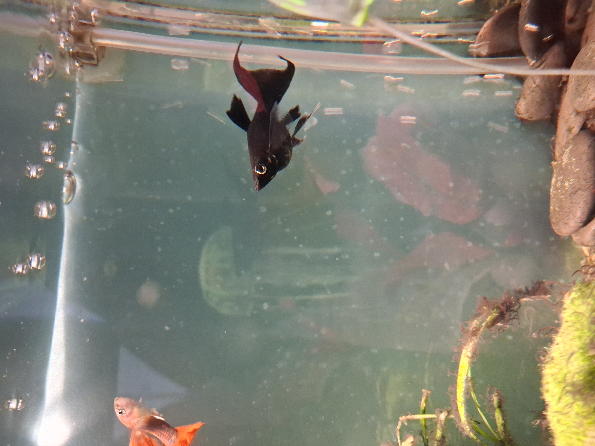 The image depicts an aquatic environment, specifically an aquarium, containing two fish and various submerged elements. **Location:** The specific city of Varna, Bulgaria, cannot be determined from the visual information present in the image. The scene is an interior view of an aquarium. **Scene Description:** The primary subjects are two fish. On the upper left, a small fish with a reddish-orange tail and ventral fins, and a darker dorsal region, faces generally right and slightly upwards. Its eyes are visible. On the middle-right, a black fish with a distinct, elongated, and deeply forked tail fin, which is dark red or maroon, faces left. This black fish has prominent white or light-colored eyes. The environment is characterized by water containing numerous small air bubbles, particularly near the top surface and scattered throughout the water column. The background behind the water appears to be a muted greenish-blue. Reflections of external light sources and indistinct shapes are visible on the glass of the aquarium. The bottom of the aquarium features a substrate composed of various rocks or pebbles, predominantly in shades of brown and grey. Green, moss-like aquatic plant matter is present on the substrate, particularly on the left side, intermingled with darker, stringy algae or plant growth. Aquarium equipment is visible on the right side, consisting of clear plastic tubing, likely part of a filtration or aeration system, running vertically. This tubing is secured by small clear clips or suction cups near the top. A thin white line, possibly another tube or cable, is also present near the vertical tubing. No human figures are present in the frame.