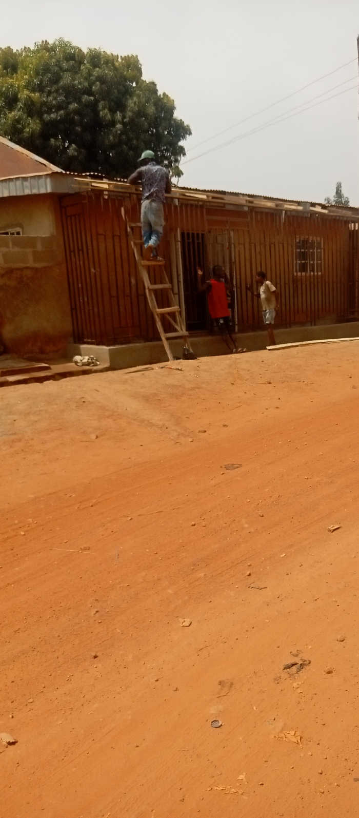 This image captures a scene in Rido, Nigeria, depicting construction or renovation activity on a single-story building adjacent to an unpaved, reddish-orange dirt surface. An adult male, wearing a patterned shirt, light blue trousers, and a green cap, stands on a rustic wooden ladder positioned against the building's facade. He faces away from the camera, with his arms raised, engaged in work on the upper wooden framing of the structure. Two children are situated near the building's entrance at ground level. One child, wearing a red sleeveless shirt and dark shorts, stands leaning against a vertical wooden slat. The second child, wearing a light-colored t-shirt and shorts, stands to the right, facing the first child. The building exhibits a corrugated metal roof. Its left section is constructed from concrete blocks, while the central and right sections feature a facade composed of closely spaced vertical wooden or bamboo slats, suggesting ongoing construction or a recent addition. A window with a white frame is visible in the right section of this slatted facade. A raised concrete foundation runs along the base of the building. In the background, a large green tree is visible behind the left portion of the building, and faint power lines traverse the pale sky. The ground in the foreground is entirely unpaved, displaying tire tracks and scattered small debris.