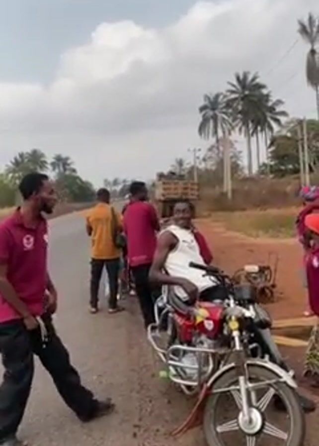 The video opens to show a group of people standing by the side of a road. Most of the men in the group are wearing maroon shirts. One man is sitting on a red motorcycle, posing and smiling. A few women in colorful dresses and headscarves are standing nearby. The camera pans to show a wider view of the scene, including a dirt road and some buildings. In the background, there's a truck and some palm trees. The overall environment appears to be a rural area.