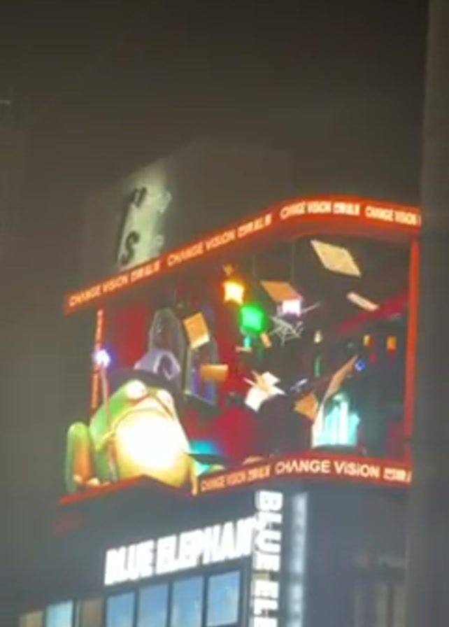 At night, a large, curved electronic billboard displays a CGI animation