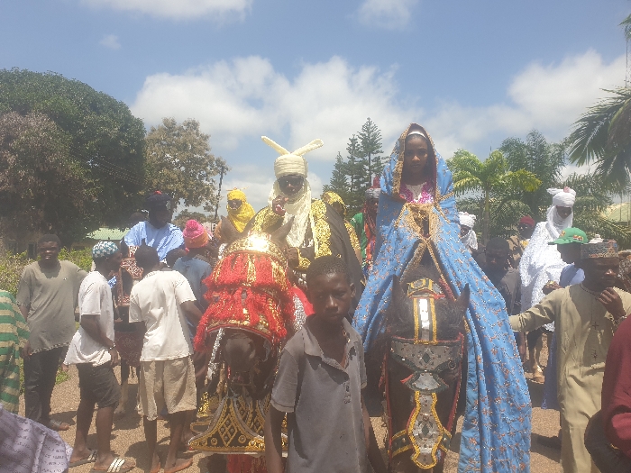 In Kaninkon, Nigeria, an outdoor scene depicts a procession under a bright, cloudy sky