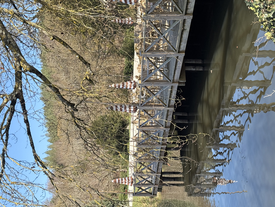 This image depicts an empty outdoor restaurant terrace constructed over a body of calm water, likely the Étang de Cernay (Cernay Pond), in Cernay-la-Ville, France. The scene is illuminated by direct sunlight under a clear blue sky, indicating fair weather. In the foreground, the bare, gnarled branches of a deciduous tree, showing early buds and some lichen, extend from the upper left and right, hanging down into the frame. The branches cast reflections on the water's surface. The midground features a weathered wooden deck or pier, supported by numerous vertical wooden posts submerged in the water. The deck is enclosed by a rustic wooden railing featuring a diagonal lattice design. Arranged on the deck are several light-colored outdoor dining tables surrounded by matching chairs. Three closed parasols with alternating dark brown and light stripes stand upright among the tables. No individuals are present on the terrace. The body of water beneath the deck is dark and still, providing clear reflections of the wooden structure, the overhead branches, and notably, a distant architectural element. On the far left of the water's surface, the distinct reflection of a slender, pointed spire, characteristic of the Église Saint-Brice (Saint-Brice Church) in Cernay-la-Ville, is visible. In the background, beyond the terrace, a strip of grassy land and a light-colored path lead to a dense forested area. The trees are predominantly deciduous, appearing bare with hints of early spring growth, and some evergreen foliage is interspersed.