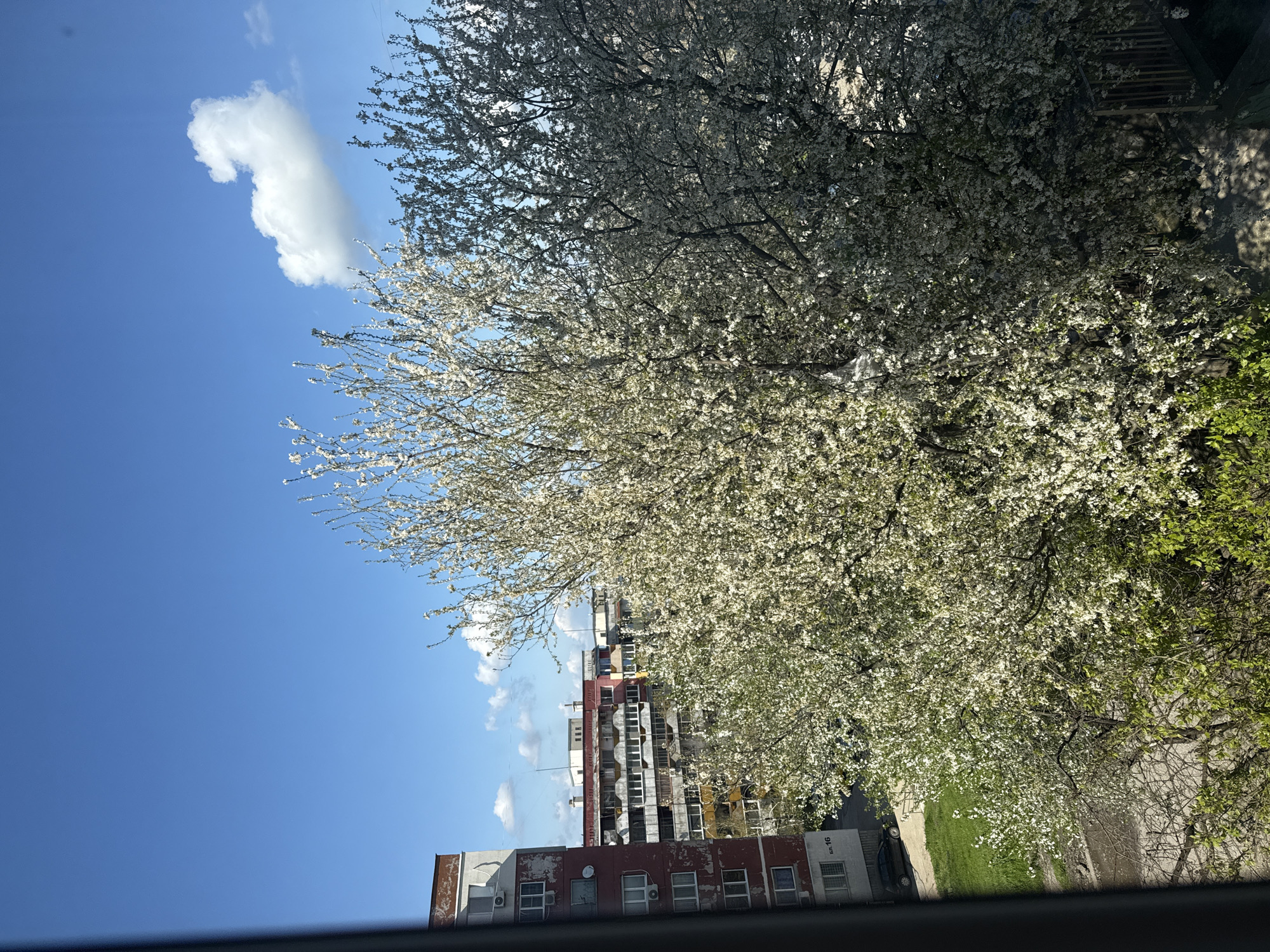 The image depicts an outdoor scene in what appears to be an urban environment, likely viewed from an elevated position, possibly a window. Dominating the right side of the frame is a large tree in full bloom with white blossoms. To the left, there's a clear blue sky with a single, elongated white cloud. In the background, a multi-story building is visible. Below the building are some trees. The area is bathed in daylight, suggesting it's daytime. The buildings and trees indicate a residential or mixed-use urban area.