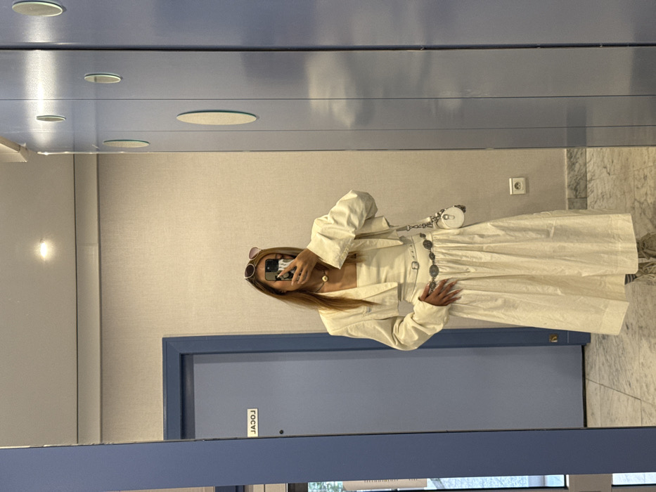 A full-body mirror selfie depicts a female subject in an indoor setting. She has long brown hair and wears sunglasses perched on her head. Her attire is an all-white ensemble comprising a square-neck crop top, a matching cropped blazer, and a pleated midi skirt. Accessories include a gold pendant necklace, a silver coin-style belt, and a small white circular cross-body bag with a chain strap. Striped socks and light-colored sneakers are visible. A smartphone obscures her face as she captures the image. The floor consists of light-colored marble or tile with gray veining. Reflected in the mirror, to the left, is a blue door with a black handle and a reversed white sign reading "LOCAL." Beyond this door, an outdoor urban view with foliage is discernible. To the right, a light beige textured wall features a white electrical outlet. Further right, a tall, light blue architectural panel displays several oval-shaped recessed or reflective elements. An overhead light source is reflected centrally near the top. The distinctive blue door with the "LOCAL" sign and the modern architectural style indicate the location is the **Fondation Louis Vuitton in Paris, France**.