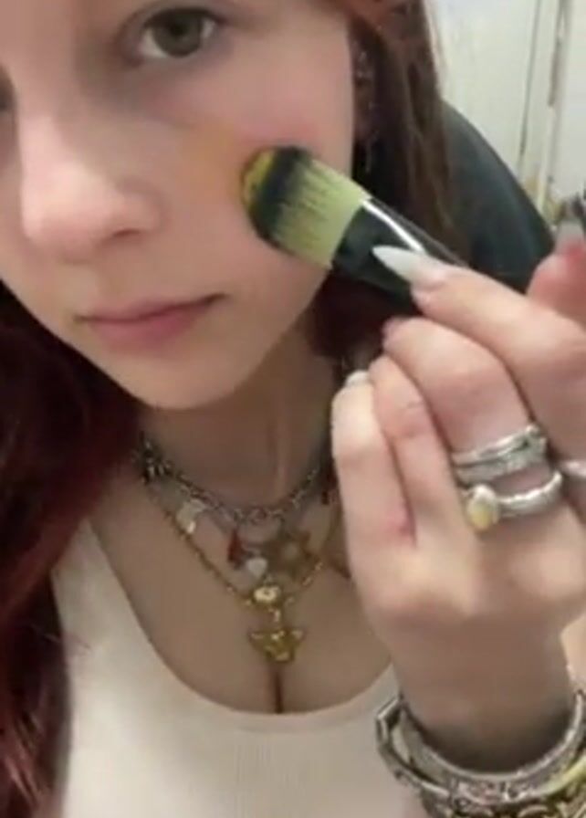 A young woman is shown from the chest up in a close-up selfie video. She applies yellow and orange makeup to her cheek with a makeup brush. She smiles and then reclines in an office chair. She is wearing a white tank top, several silver necklaces, and multiple rings on her fingers, along with silver bracelets. She has long, red-tinted hair. The environment is a room, potentially a bedroom or office, with an indistinct figure in the background.