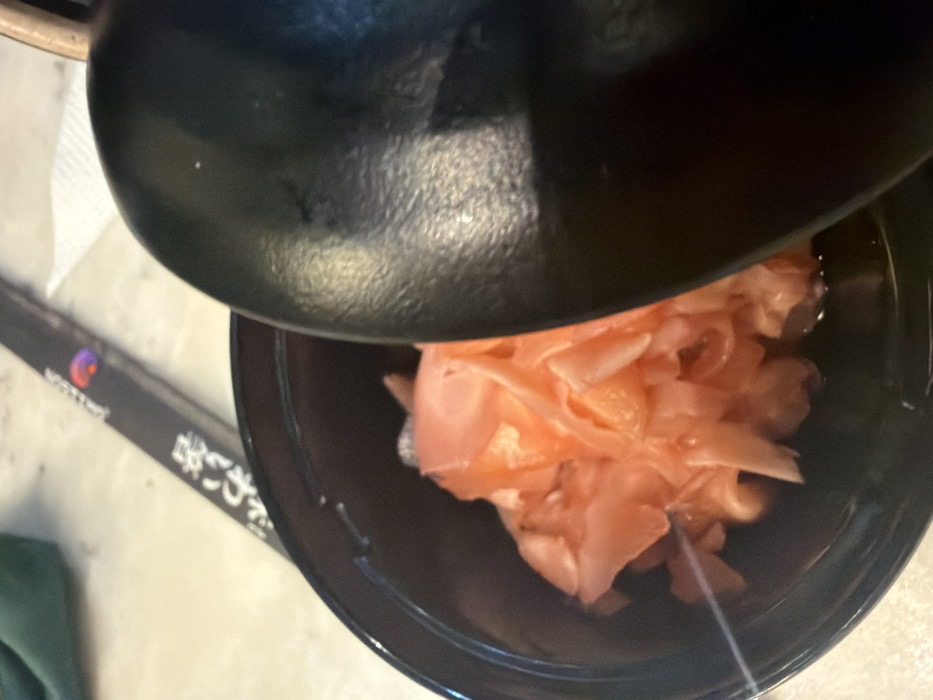 - "A portion of pickled ginger, its pale pink color prominent, sits in a black bowl, partially obscured by a black, round lid" by FM-vA9lX2, licensed under CC BY 4.0