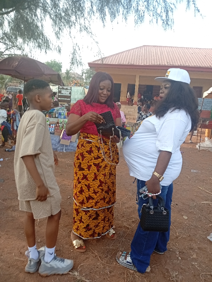 An outdoor scene in Nkwelle, Nigeria, depicts three individuals interacting on a reddish-brown dirt ground. To the left, a young male in a beige short-sleeved top and matching shorts with light embellishments, white socks, and grey sneakers, stands facing right. In the center, an adult female with reddish-brown hair wears a red lace top and a long yellow and maroon patterned skirt with gold sandals; she is smiling faintly while examining a small black woven handbag. To the right, an adult female, appearing corpulent or pregnant, wears a white baseball cap, a white t-shirt, blue jeans, and silver sandals; she holds a small black structured handbag with a white beaded chain and has a gold-colored bracelet on her left wrist. In the background to the left, market stalls are visible under a brown canopy, displaying bottled beverages and packaged goods. Further in the background, a single-story building with a red roof is present, with people gathered on steps leading to its entrance. Overhead, sparse tree foliage is visible against a bright sky. The overall impression is a casual gathering or market activity.