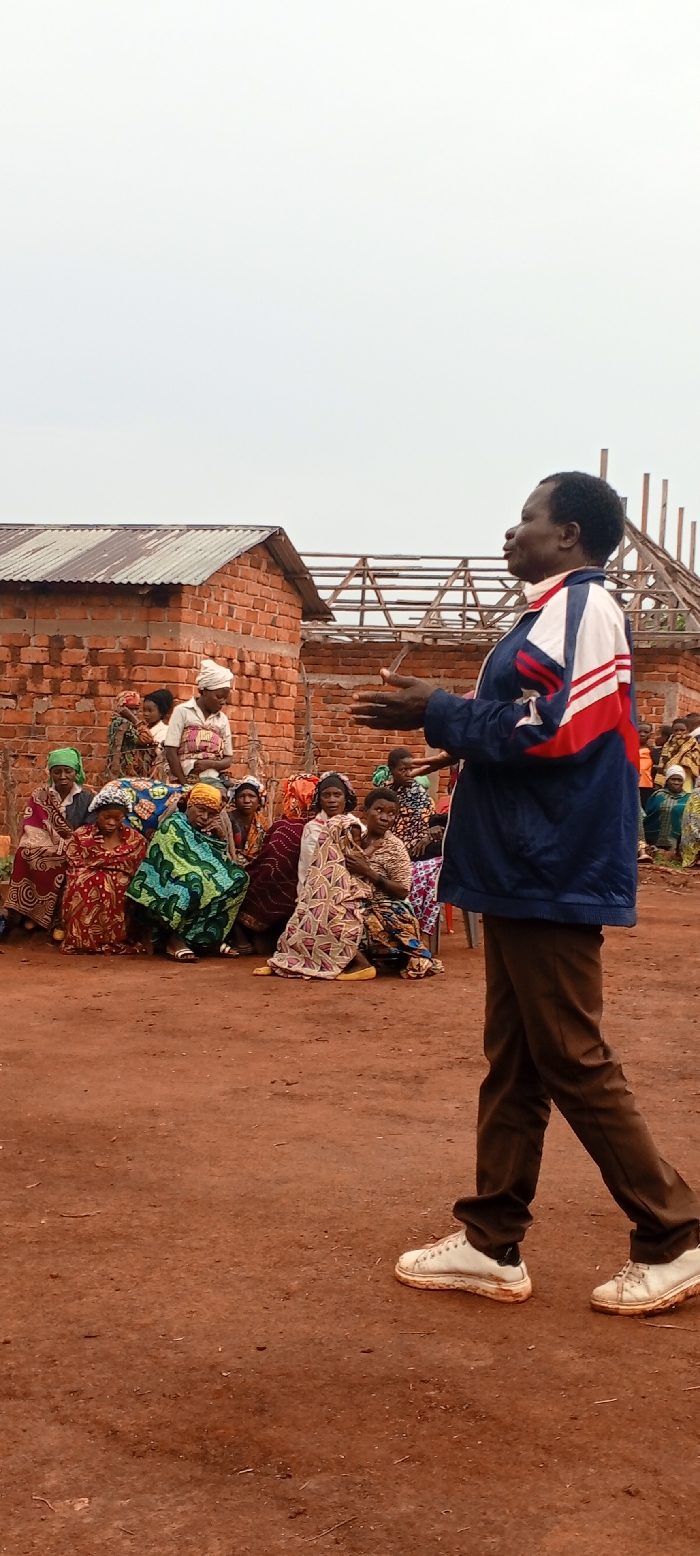 A man in a blue and white jacket, brown pants, and dirty white shoes walks and gestures towards a seated group of women in colorful fabrics. The women are gathered on red soil, with brick buildings and a partially constructed roof visible behind them. The sky is overcast, suggesting an outdoor gathering in a rural area.
