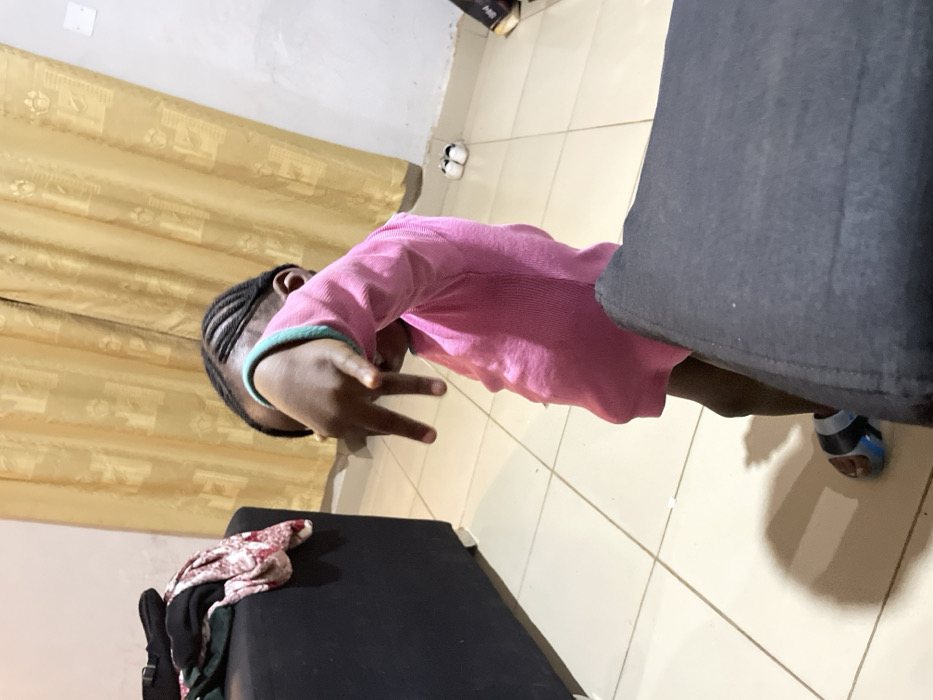 A child in a pink sweater flashes a peace sign. The room has yellow curtains and tan tile floors. An armchair takes up a significant portion of the space. A covered bench is partially visible with some discarded fabric. The lighting is soft, with shadows indicating a single light source.