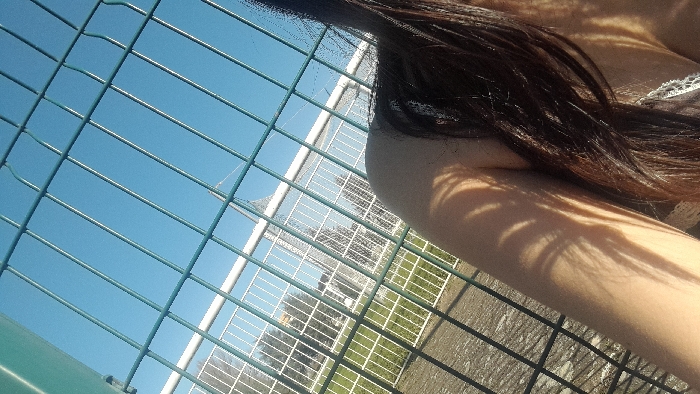 An outdoor image, captured at a diagonal angle on a clear, sunny day in Schiltigheim, France, depicts a scene viewed through a teal-green wire mesh fence. In the immediate foreground on the right, the bare right shoulder and part of the head of an individual with long, dark brown hair are visible. Distinct shadows of vertical bars are cast across the person's arm and shoulder, indicating direct sunlight. A portion of a light-colored, possibly lace-trimmed, garment is discernible on the person's upper chest area. Beyond the teal-green fence, a sports field is visible, characterized by a well-maintained green grassy surface. A white metal perimeter fence encloses the grassy area, and white tubular goalposts, including a crossbar and a vertical support, are discernible within the field. Several deciduous trees with bare branches are present in the distant background. A paved or dirt path runs alongside the grassy field in the mid-left. The sky above is uniformly clear and bright blue. The location is consistent with a sports complex or municipal stadium within Schiltigheim, France.