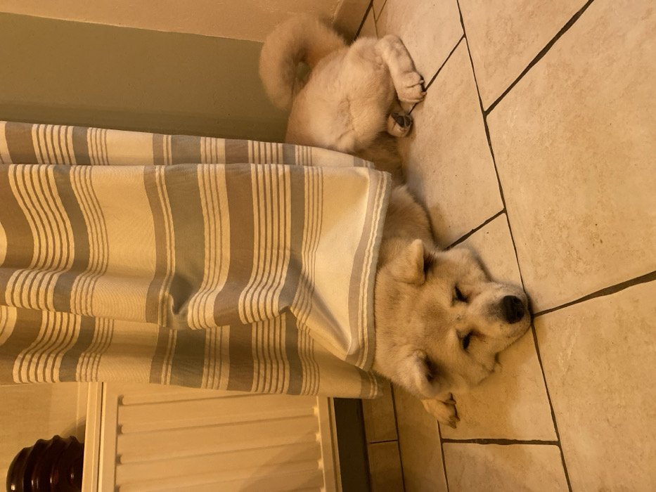 - "A light-furred dog with its eyes closed lies on a tiled floor beside a striped shower curtain" by FM-xTDQG2, licensed under CC BY 4.0