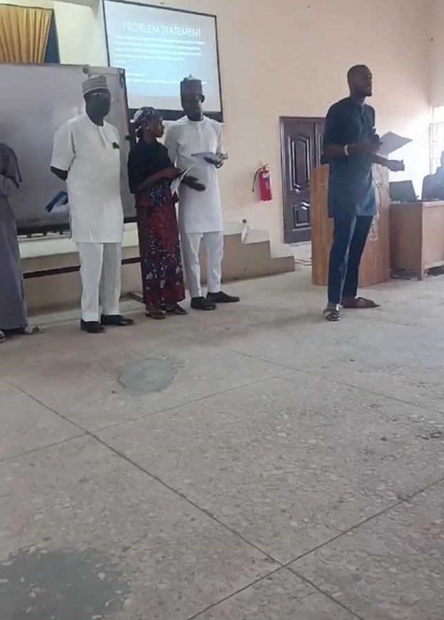 n indoor room with five people standing in front of a projection screen that reads "PROBLEM STATEMENT." One person is facing the camera and holding a document, speaking while gesturing with the other hand. Two people stand to his left, also holding documents. Further left is a fourth person, and partly visible is the fifth. The speaker is wearing a black outfit and sandals. The others are wearing traditional clothing. Behind them is a wooden podium, a fire extinguisher, and a closed brown door. The floor has a speckled, light brown pattern. Sunlight streams through a window at the back of the room.