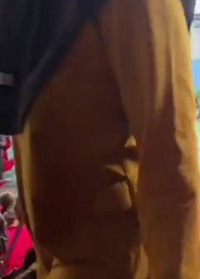 group of children and adults at what appears to be a water park or pool facility. Children in swimsuits are sitting along the edge of the pool. A few women in hijabs and matching red outfits are standing in the water, interacting with each other. A mushroom-shaped fountain is in the middle of the pool, spraying water. Adults, also dressed in street clothes, stand behind the children along the pool's edge, possibly watching or supervising. The area around the pool is tiled, and the sky is visible above a covering or canopy over the pool area. A large yellow tank is located in the background.