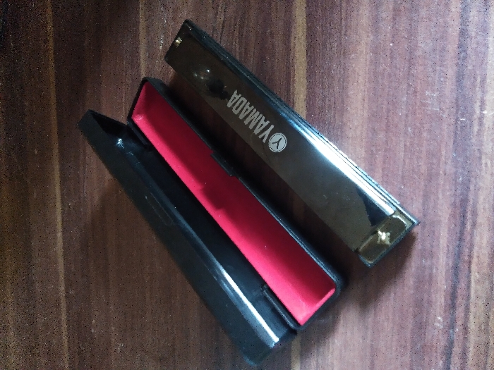 - "A black Yamada harmonica lies on a textured dark wood surface" by FM-zOoQH3, licensed under CC BY 4.0
