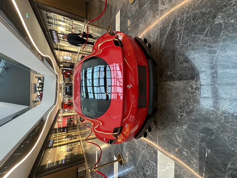 The image displays the interior of a modern, multi-level shopping mall in Tashkent, Uzbekistan. A glossy red Ferrari Roma, viewed from the rear, is centrally positioned in the foreground on a polished dark grey marble floor with white veining. The vehicle is displayed behind a cordon of gold stanchions connected by red velvet ropes. The Ferrari features quad exhaust tips and a temporary black license plate frame; the Ferrari emblem is visible above the license plate area. Its rear window and body reflect overhead linear lighting and architectural elements of the mall. To the right of the displayed car, an adult male in dark attire walks forward, holding the hand of a small child dressed similarly. Along both sides of the mall corridor are retail storefronts with large glass windows, including "PESENICO" and "CONSTELLA," exhibiting merchandise and mannequins. The mall's contemporary architecture includes curved upper-level walkways with glass railings and integrated linear lighting fixtures along the ceilings and edges.